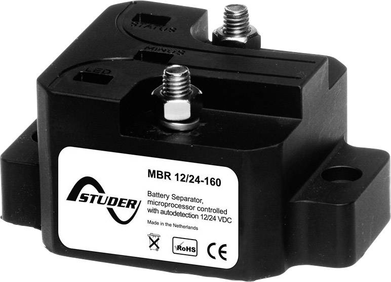 Die Batterierelais (MBR) sind Leistungsstarke mechanische Kontakte angesteuert von einem Mikroprozessor. Ein MBR kann verwendet werden wenn eine System aus zwei Batterien besteht (Starter- und Hilfsbatterie), oder einer Starterbatterie und Gleichstromver-brauchern (12V Lampe, usw…), wie zum Beispiel auf Booten oder Camping-Fahrzeugen.